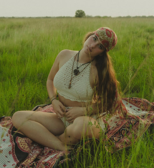 I crochet every piece by hand, with love and intention. My son brings the vision... he’s the one keeping us growing, sharing what we do in fresh, creative ways. We work together with an amazing team of beautiful women who believe in the magic of this brand. It’s all from the heart.