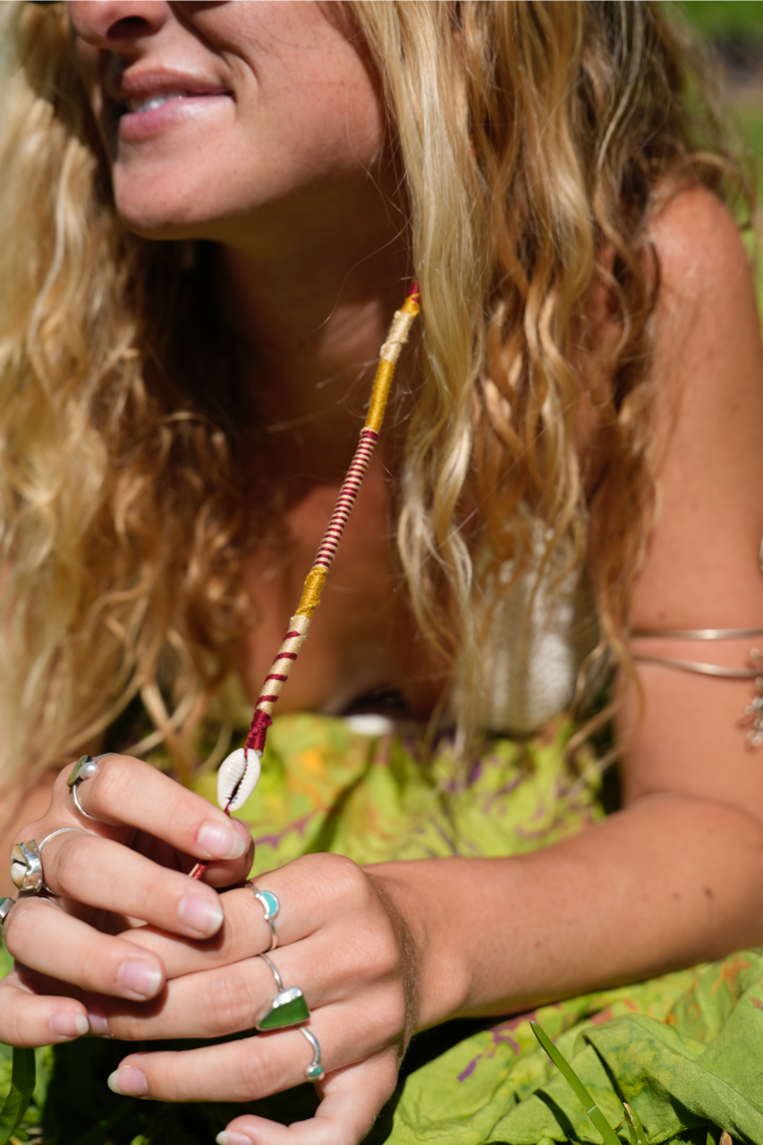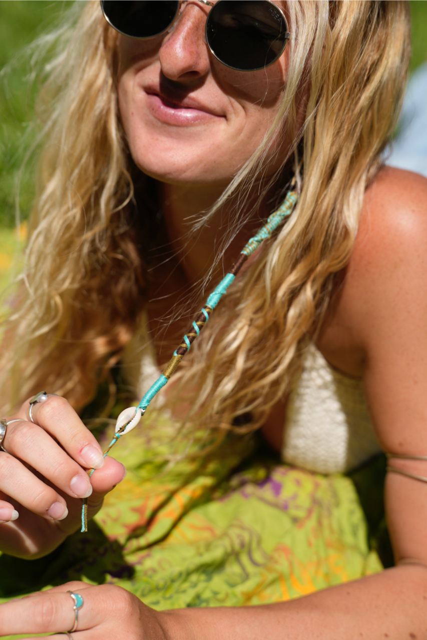 Handmade with love at Soho Bohemian. Each wrap features a real cowrie shell and comes with a brown wig snap clip for easy on and off wear.