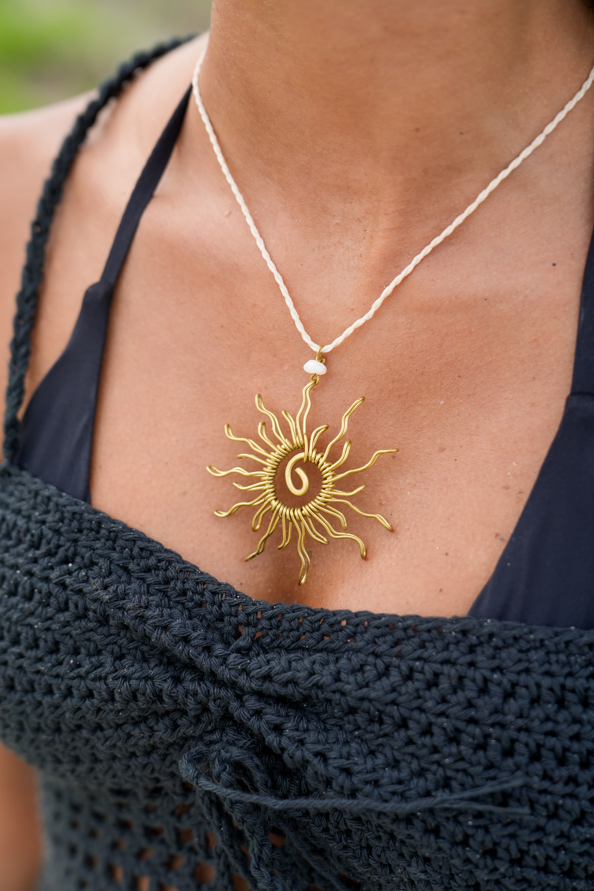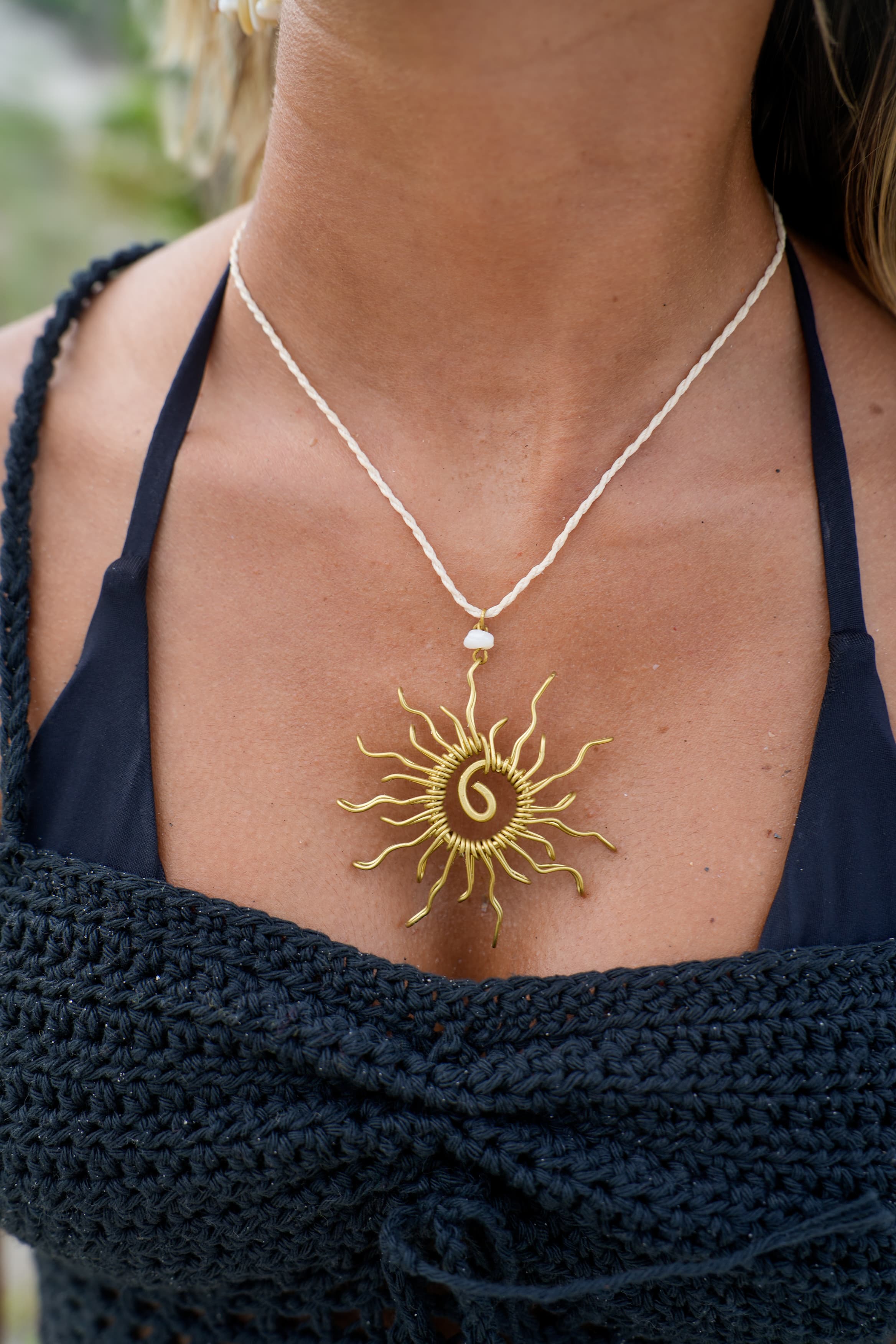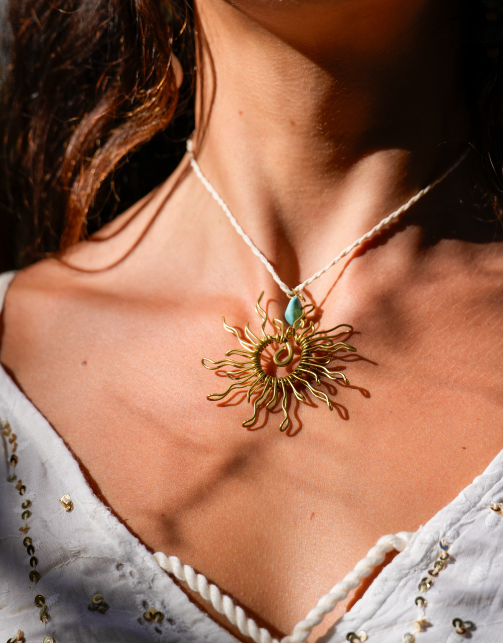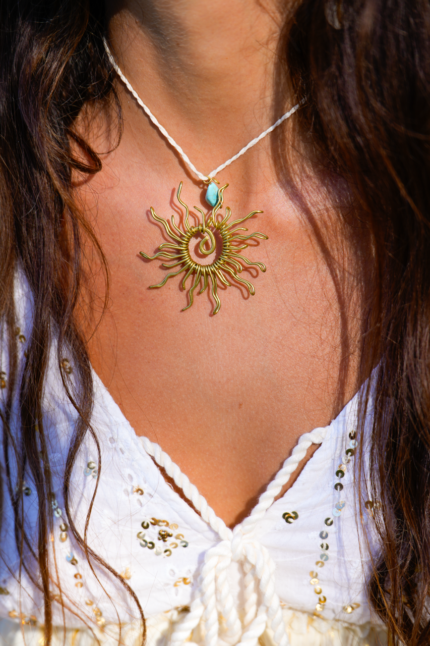 The Sol Necklace is a golden sunburst pendant, radiating warmth, light, and free spirited energy. Handcrafted from 100% bronze, this piece captures the essence of the sun, making it the perfect talisman for festival queens, boho dreamers, and ocean lovers. With an adjustable chain, you can wear it as a choker or let it rest over your heart like the cosmic treasure it is.
